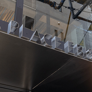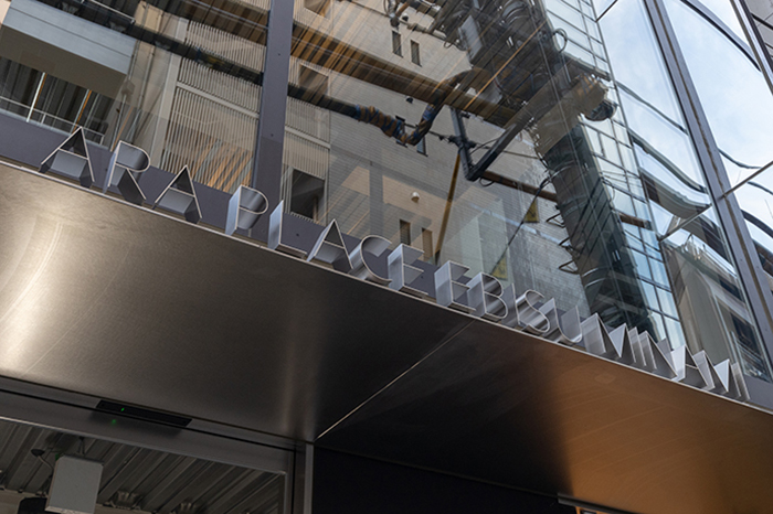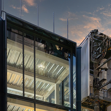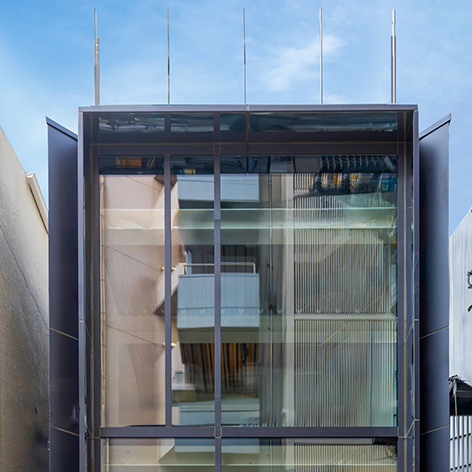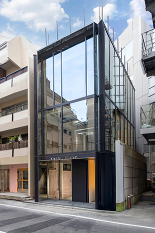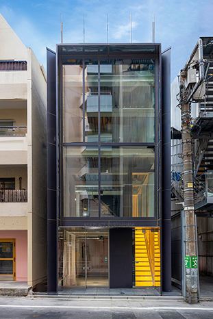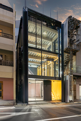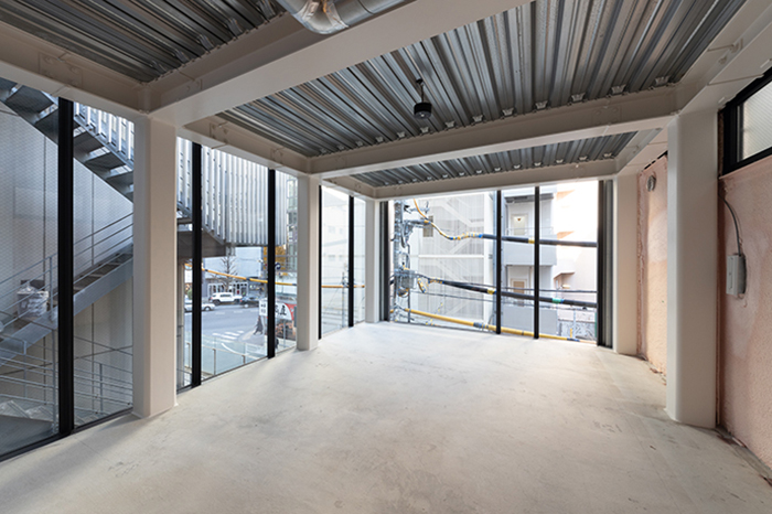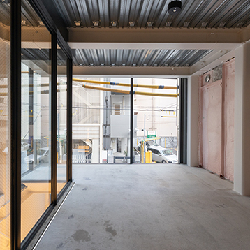 防火性能と意匠的なシャープさを兼ね備えるファサードデザインは、全面をガ ラス張りとすることで開放感をもたらし、また隣地側側面も同様な納めとする ことで目線が建物空間の奥へ抜けていきます。内部空間が見える構造となり、 いずれ入るテナントの情景でさえもファサードのデザインの一部とする魅せ方 は、洗練されたこの街に非常にフィットしています。