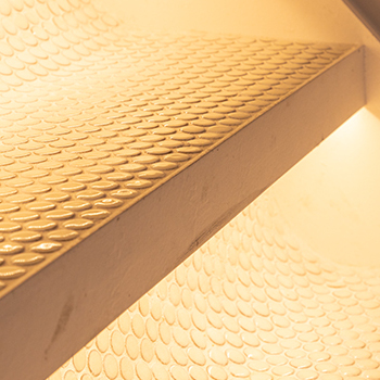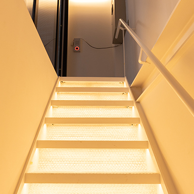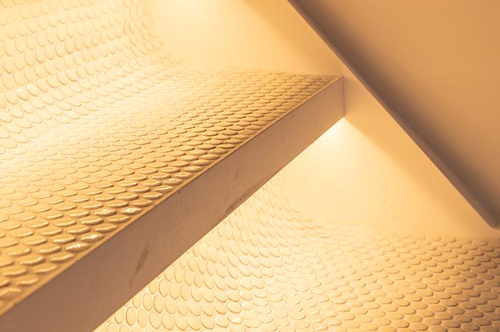 外壁には特別に調色した塗装処理を施したスチールパネルを採用。重厚感があ りながらも、漆黒の美しさが建物の枠を引き締め、建物のステータスを底上げ。 建物上階へと誘う共用階段には、名古屋モザイクタイルのチェルキオを敷き詰 め、間接照明でR 形状の蹴上面を照らすことで、優しい光が溢れる足元とな りました。
