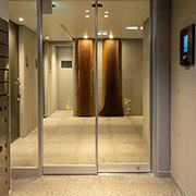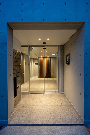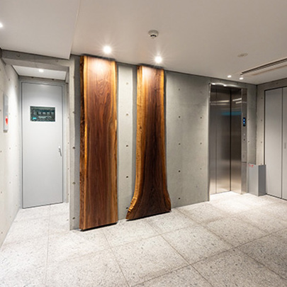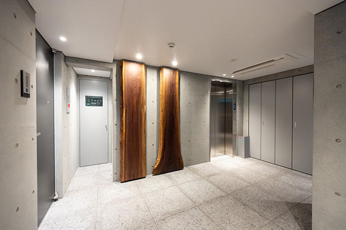 く趣ある姿に、新しく建てる建物も、隣地に建つに相応しいものにするにはどの ようにするか思考した。 そんなとき、事業主が所有していた立派なけやきの一枚板に着目。いつか時期が 来たときに使用しようと保管していたものを思い出し、街の雰囲気、浄栄寺の重 厚感。この建物と調和させるにはうってつけだと考えた。設置場所は、建物の顔 であるエントランスに他ならない。年輪の位置などを吟味し、現場合わせをおこ ないながら、1 番表情が表れる位置でカット。その場で加工、設置などをおこない、 最高の状態で配置することができた。