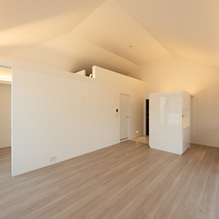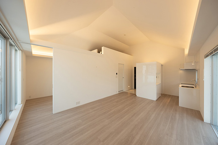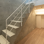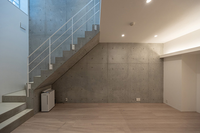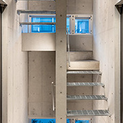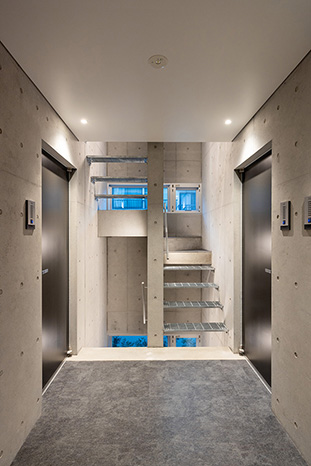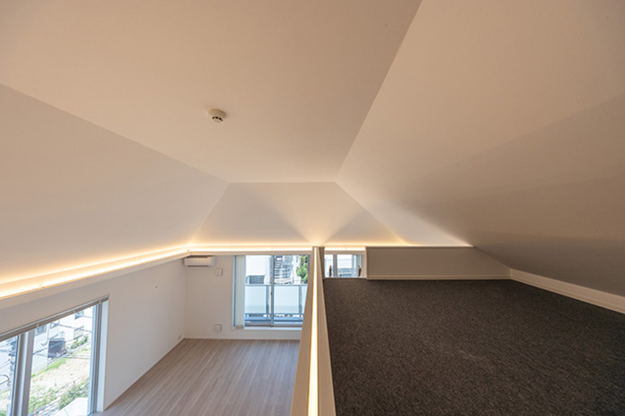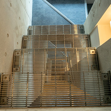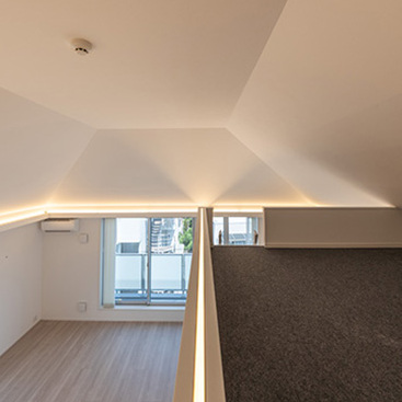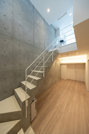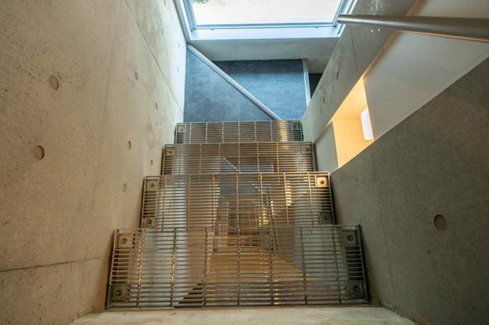階段室の踏板は、底が見えるグレーチングを採用。照明の面落ちが階段室の奥深 くまで届き、奥行とストレートのラインを美しく表現。また、ハレーション面を ホワイトにすることで、柔らかく反射した光が竪穴を綺麗に抜けるよう意識して いる。法規上ギリギリの寸法で設計したが、前記の演出によって「魅せる階段室」 となった。 階段室をギリギリまで省いた分、室内などの大切なところは広く取り、開放感と アレンジのしやすい自由空間、さらに最上階は遊び心を散りばめた室内計画となっ ており、そのメリハリのある考え方は、ワークショップ時代から変わっていない 私の設計ポリシーである。
